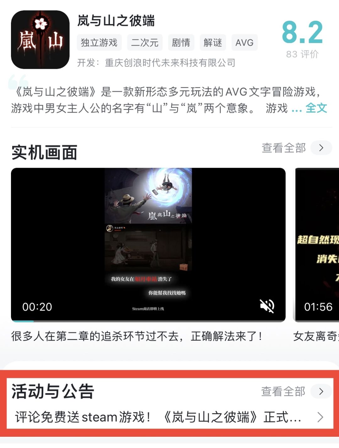 各位侦探们可以点击游戏详情页中的置顶活动公告,添加愿望单,参与抽《岚与山之彼端》Steam激活码!