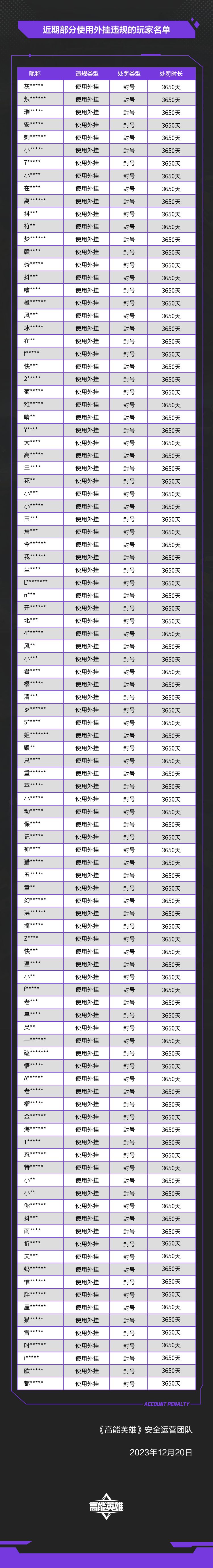 《高能英雄》外挂作弊处罚公告(12月20日)
