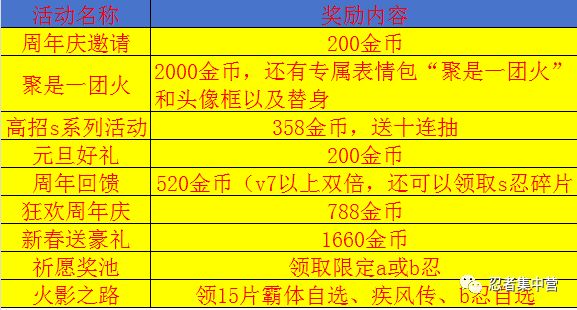 活动介绍合计本次活动能拿4066金币,百战水门和限定招募忍者任选一个,我的火影之路出了自选疾风传b忍,还能拿15片霸体,会选到气旋,还会随机出s忍和a忍,然后永恒佐助送十连抽,聚是一团火的表情包本周就能领取到;这个火还是可以移动的,倒计时在下周,有祈愿石头材料,还有s忍者体验卡,然后祈愿奖池里,也有材料和a.b忍者整卡自选,可以期待一波,1.6号高招佐助上架当天还可以领取280金币,这就是燃活动也可以领取1500金币,周年庆活动当天高招,会有很多金币可以领取,高招后的第二周就是周年庆狂欢。