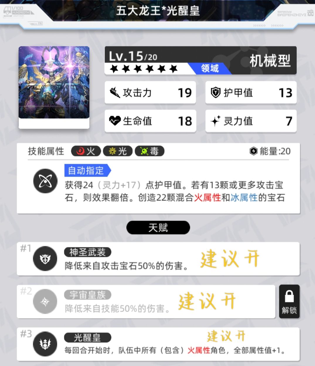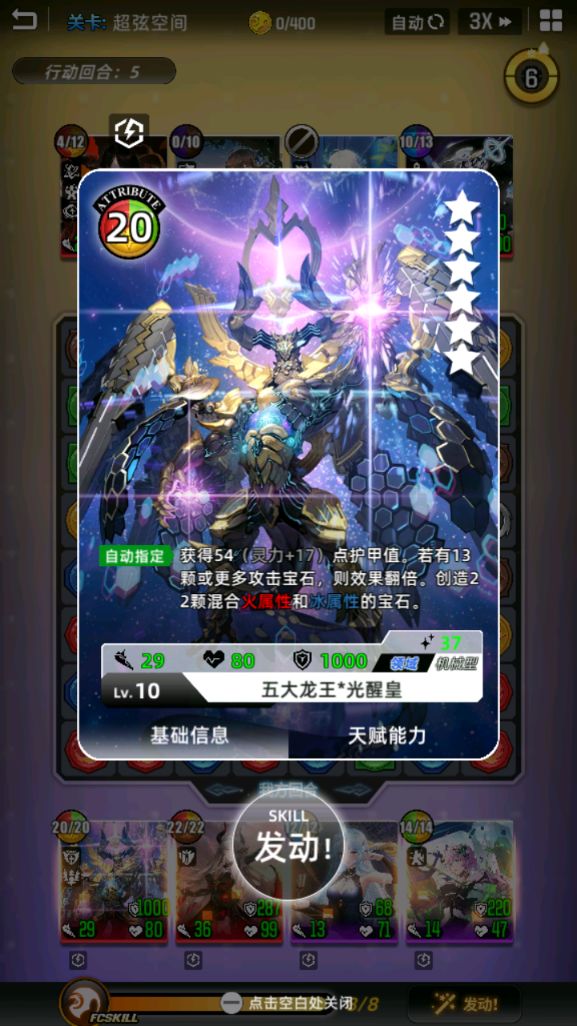 在光醒皇断档后来狠狠地来一发(实战在火翻倍触发相对稳定时,光醒皇平均释放3次技能充满一次小芙)2动光醒皇,提高自身护甲并超模创造22颗火与冰宝石(实测不是11+11,数量随机,不会相互覆盖)