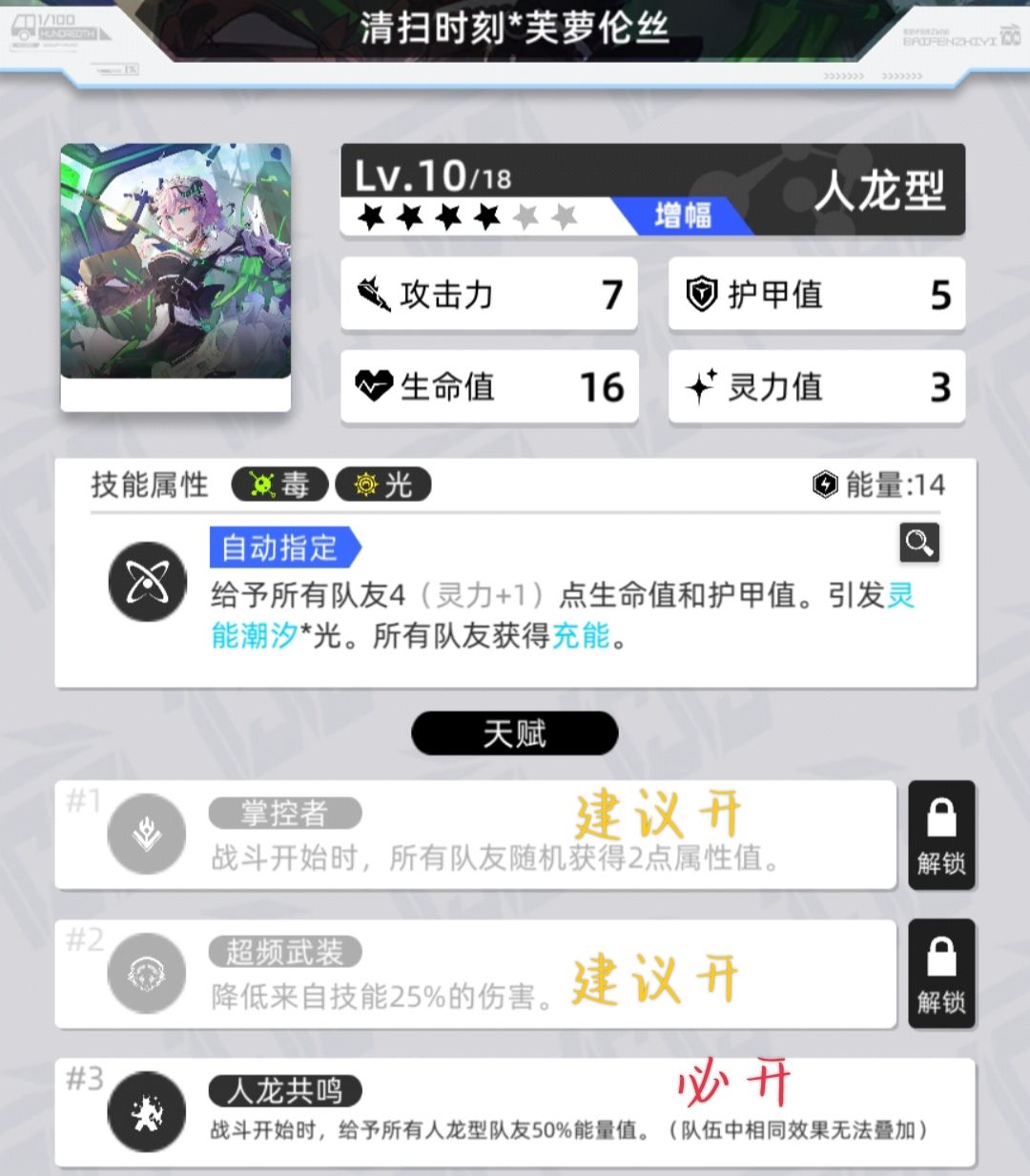 光醒皇与芙的技能灵力收益较高,优先提升队伍扛刀位光醒皇与队伍核心输出小芙的等级(优先升至10级以上)