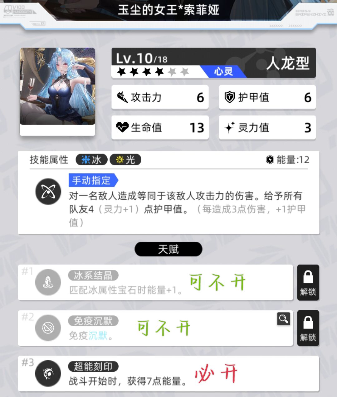 且自身为队伍唯一吃冰充能的角色,后续对局中基本会保持满能量状态,在小芙与光醒皇充能未满时进行补伤叠甲,若对局环境较差光醒皇无法多动,可以手动消冰宝石让玉尘先处理敌方关键单位(通常是敌方清能量与上负面效果的单位)