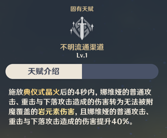 不过需要注意的是,由于固有天赋的存在,娜维娅开E之后的普攻会有4秒的岩附魔,普攻伤害也会提升40%,可以用这段时间普攻打点输出,顺便产一点结晶片,因此普通天赋等级推荐升级一下。