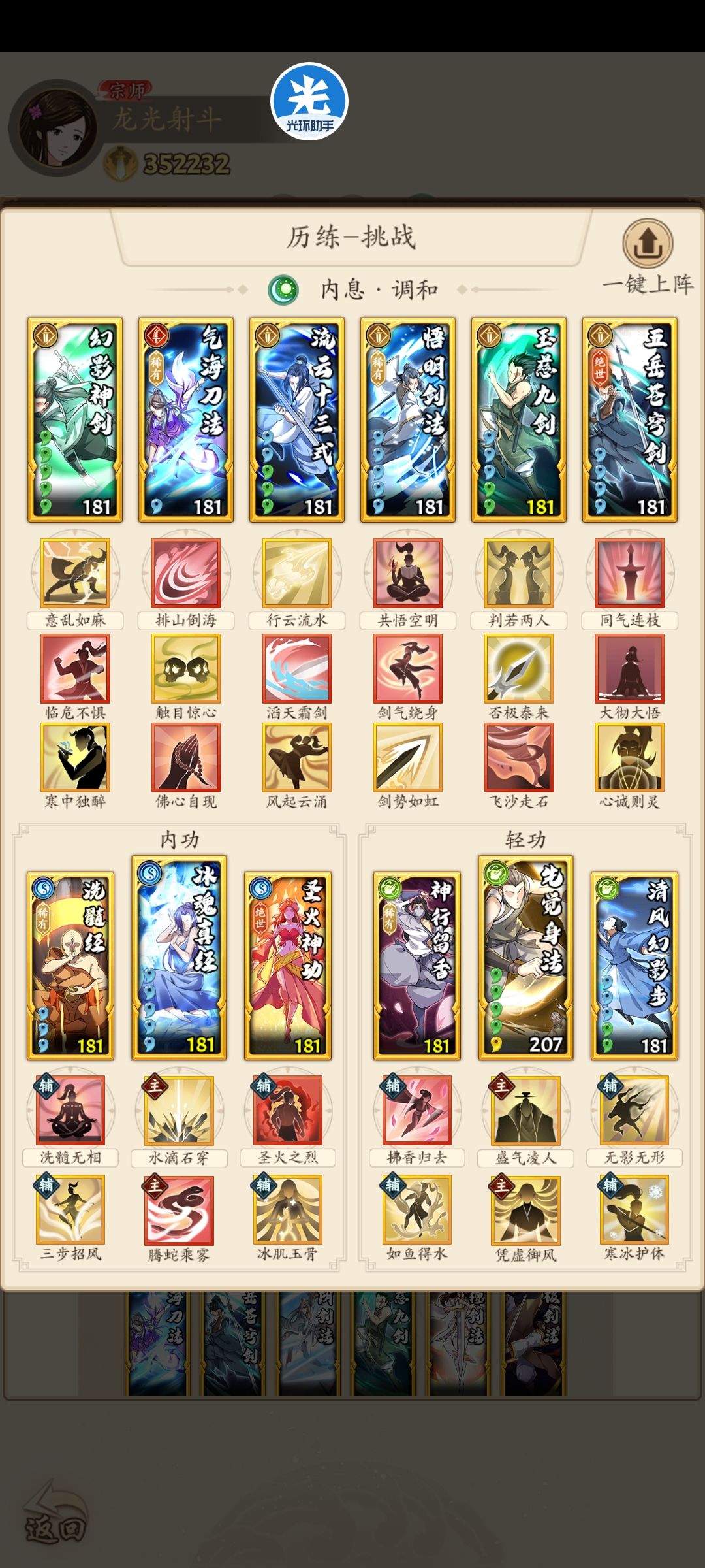 然后是轻功副位的选择,清风肯定锁了,剩下一个位置,葵花很变态但是要绑定潜龙,我没开出来潜龙所以没考虑,没风魔这个点,韦家和神行相比,肯定是神行比较香的,神行有回血很实在,拳拳人太多了占了百分之六七十吧,不带神行一点儿点穴抗性都没,就搁那儿站着光挨打,副韦家不如主如鱼带点儿回春,还能蹭蹭聚气来的收益高。所以轻功三个位置,主先觉,副清风神行,心愿就拉先觉清风,神行韦家啥的都不用拉,后面直接用雪中行比较容易。