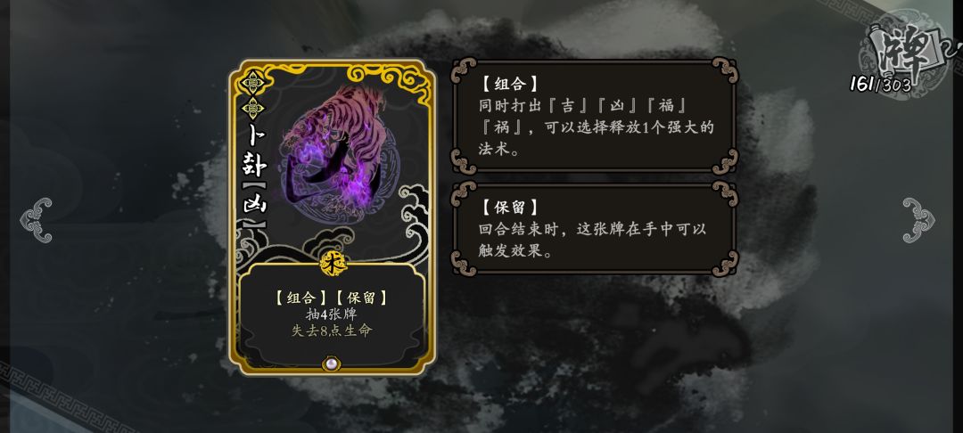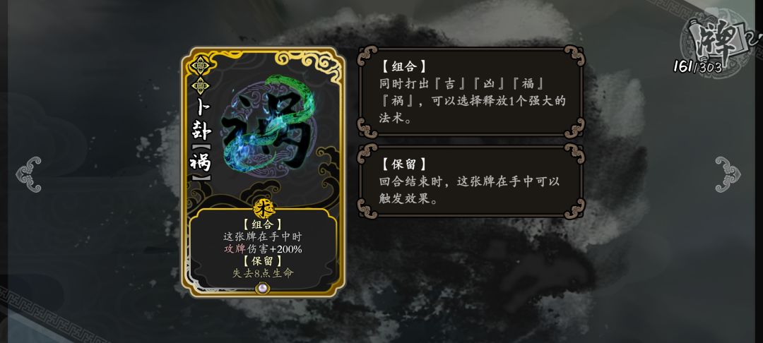 其他可以拿的卡有:杀机,无中生有(复制杀机或者点穴尺),卜卦凶(掉血抽卡完全是白嫖,回血的宝物太多了,可以一回合秒BOSS),卜卦祸(加伤害,其实成型后加不加都是秒)