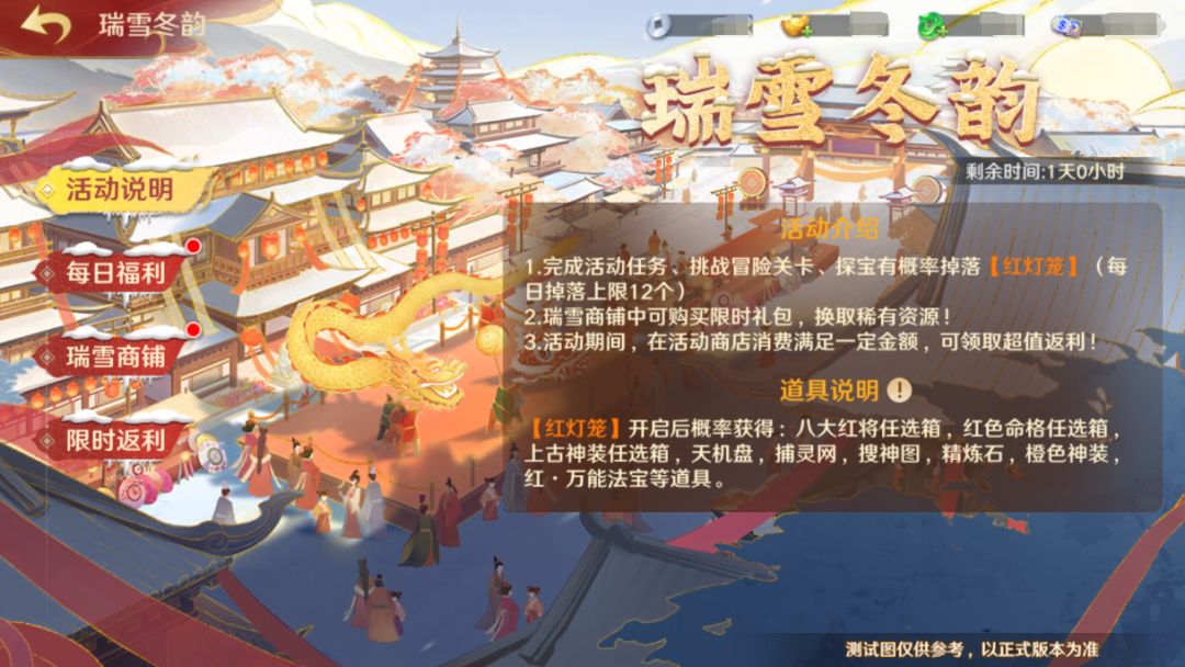 活动期间,守护使大人可以通过完成每日福利活动获取【红灯笼】,以及额外的元宝奖励。