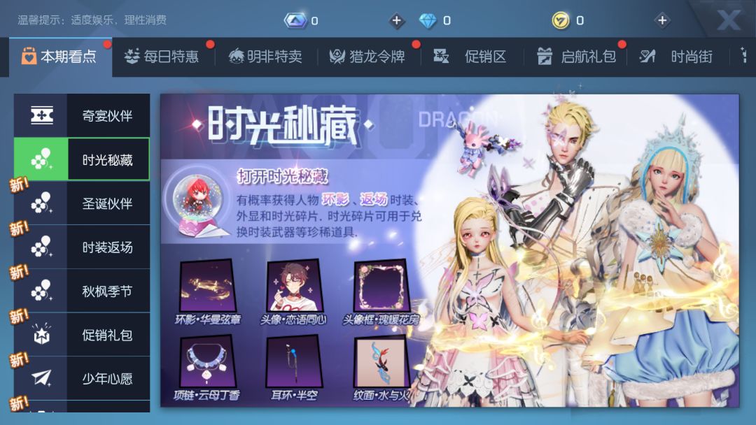 时光秘藏携人物环影、往期时装武器、时装、发型、头饰等外观限量返场啦,听说首周外观概率将提升30%哟!