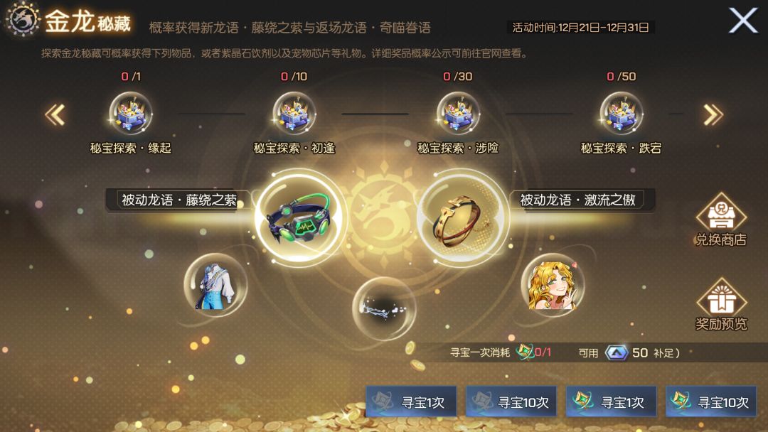 活动期间,在商区-宝贝店购买并使用金龙之瞳可在金龙秘藏活动中进行宝藏探索,届时即有概率获得全新金色龙语-藤绕之萦、返场金色龙语-奇喵眷语、返场时装·随风之舞·衣、返场头饰·随风之舞·头饰、返场头像·早安哈尼、返场头像框·可爱颂、铜绿粉尘、时空之砂、随机金色龙裔技能、11级圣核兑换券、5级龙蜕凝液、5级龙蜕精华、橙色与紫色宠物芯片、橙色龙裔技能、橙色宠物辅助技、橙色宠物潜能芯片、橙色与紫色继承者技能等珍奇秘宝以及龙之契约、赋能礼盒、星阵礼盒、紫晶石饮剂、稳态晶块等超值道具。