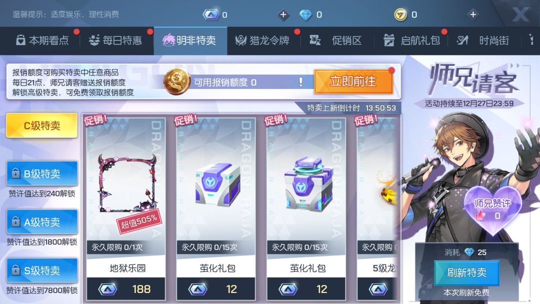 购买特卖中的商品可以获得路明非师兄的赞许,逐渐开放高等级特卖,每次解锁新特卖时,可在师兄请客界面领取奖励!购买货架商品可逐渐解锁包括头像框·地狱乐园、纹身·烁籁之旭、头像·幽影启示、头饰·蹦蹦狂想曲和限时返场的头饰、头像、纹面、龙纹升级材料等超值商品!