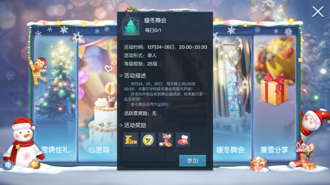在12月24、25、26日,每天晚上20:00至20:30,卡塞尔学院暖冬舞会将盛大开场!活动时间内前往教堂参加舞会,即可获得经验、金币、雪漫枝头礼盒、冬月摩羯礼券等奖励哦~