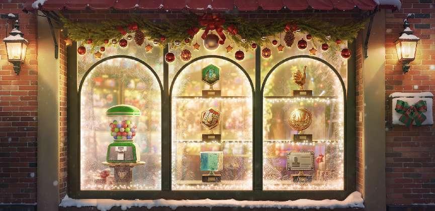 装饰精美的纪念品小铺限时营业中!橱窗中展示着金光闪闪的纪念代币,定睛一看竟十分眼熟!这些纪念代币表明您在今年获得的成就。旁边还有一台功能齐全的纪念品售货机,他会为胜利者发放奖励。