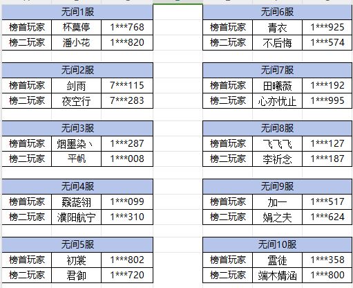 游戏内前十个服务器玩家,即无间1服-无间10服。