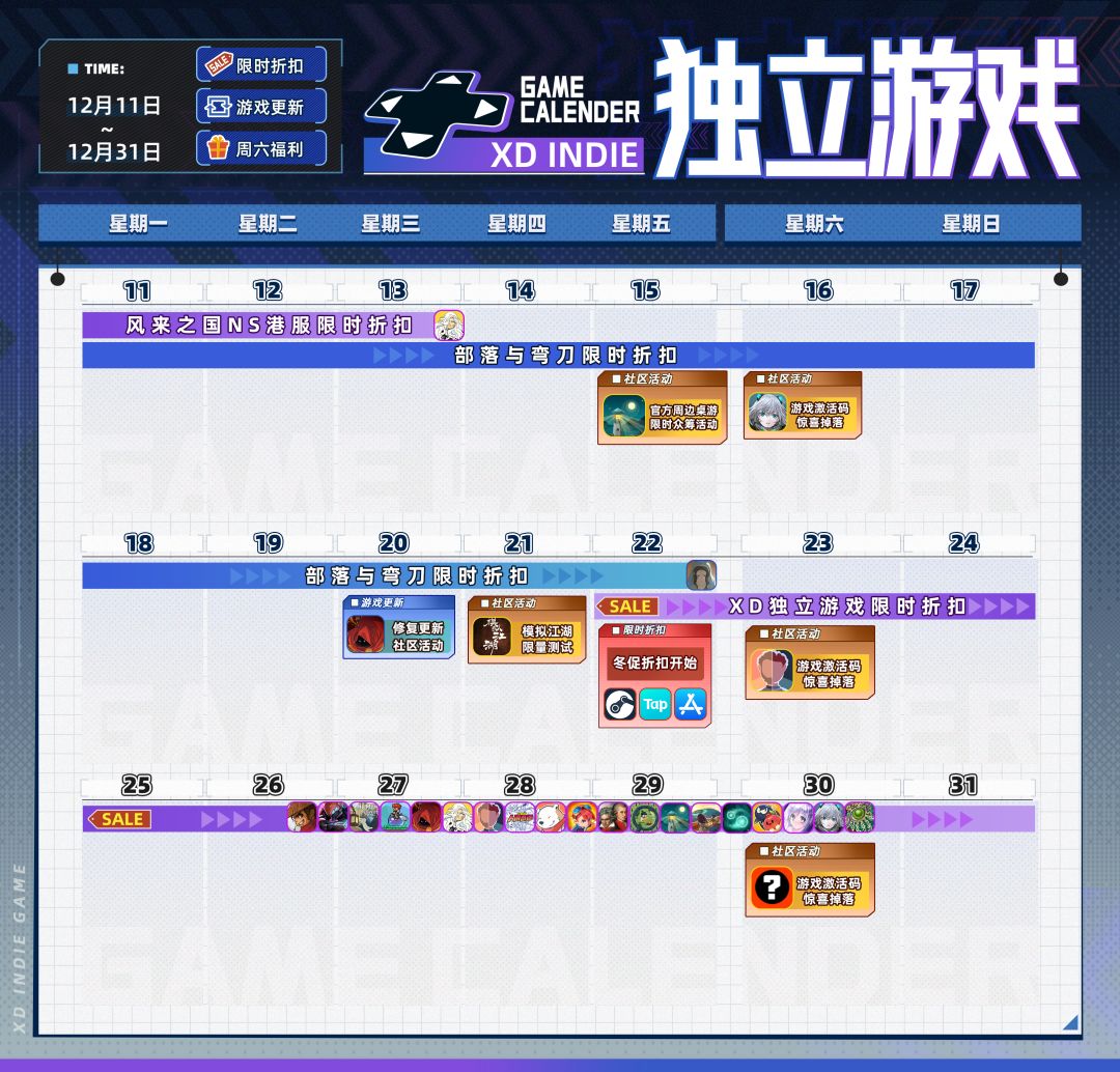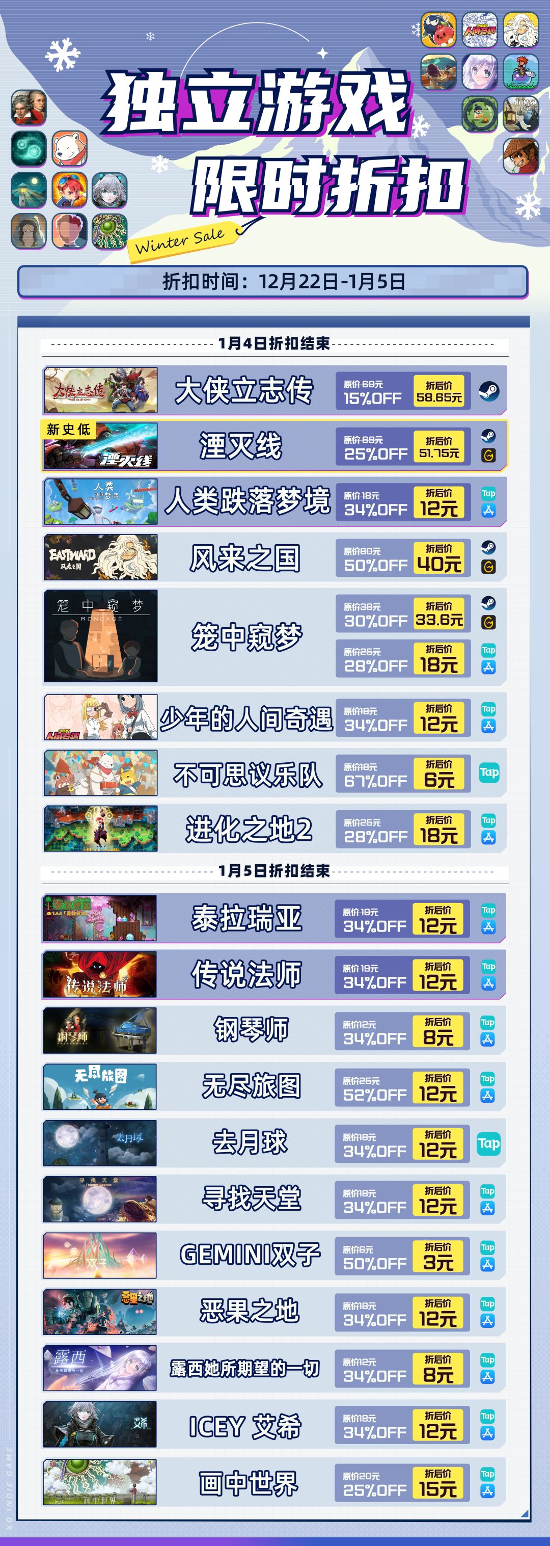 冬促活动如期而至!12月22日(本周五)起,XD独立游戏的部分游戏也会参与冬促活动,在Steam、TapTap、iOS各平台都有相应的折扣游戏,大家可以看看是否有自己关注的游戏。