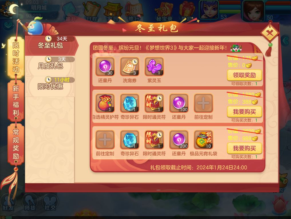 2023年12月21日维护后至2024年1月24日24:00,服务器等级≥50级的玩家可前往奖励界面领取冬至礼包。
