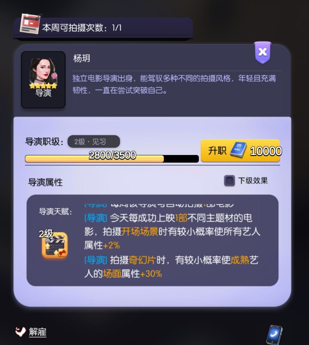 导演分为一星到五星,最多可以招募30个。其中1~2星提升对应题材艺人在拍摄高潮场景时候的属性增幅。3~5星则是在对应题材剧本中,全程提供某种类型艺人的属性增幅。