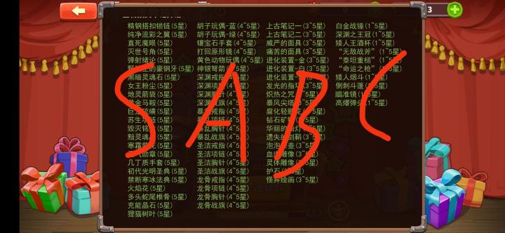 首先在宝物抽奖页面你是可以看到不同种类的宝物有不同星级。按照图里的宝物分布情况,我按照宝物稀有程度分成了sabc四个档次。然后从c档开始挨个跟大家聊一聊每个档次可用的宝物。每一个档次里,低星可用的高星当然是更好。