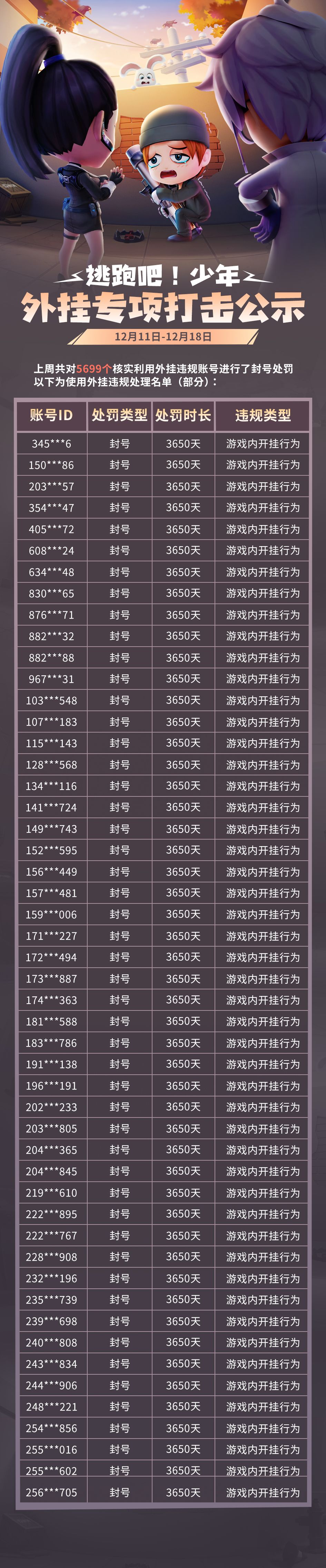 《逃跑吧!少年》项目组致力于打造健康、绿色、公平公正的游戏环境,对于各类恶意破坏游戏正常秩序的行为,我们都将严格审查!一经核实,将对《逃跑吧!少年》游戏环境带来恶劣影响的玩家采取封禁处罚等手段,视情节严重者,将追究其法律责任!