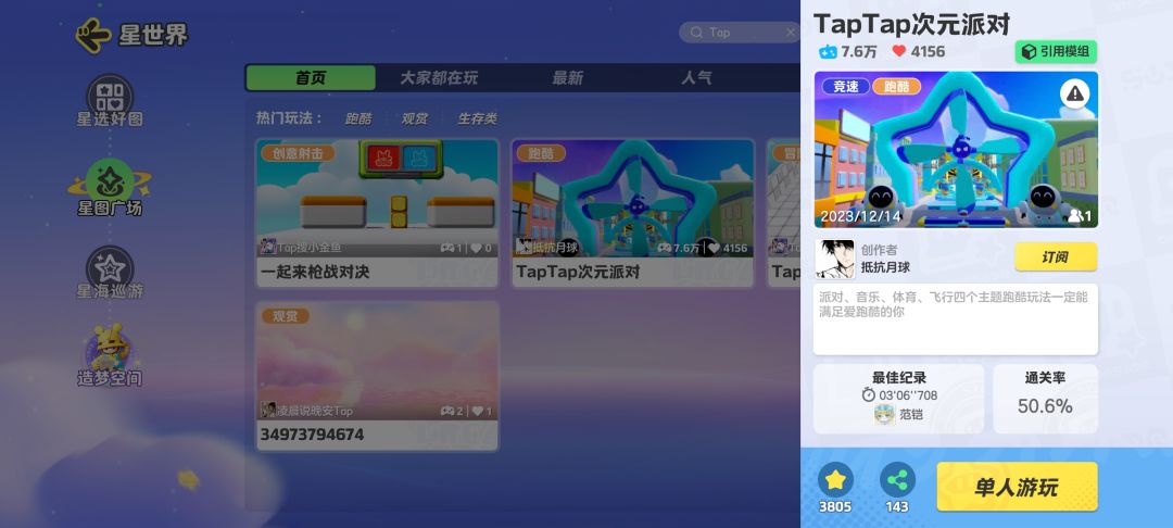 想要玩到次元之星地图必须在左上角的星世界里搜索,记得Tap这个词一定要大写哦!