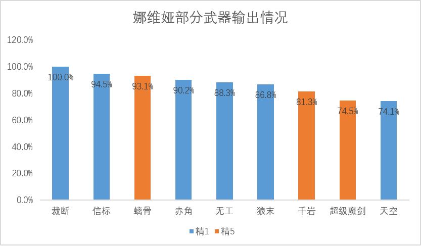 可以看到,娜维娅输出最高的武器还是专武裁断。但相比于裁断最大的优点外观毕业来说,其自身的武器强度并没有领先其他武器太多,相比于满精螭骨剑来说,也提升得也不算多。可以说,在强度方面,这把武器的提升是比较低的。