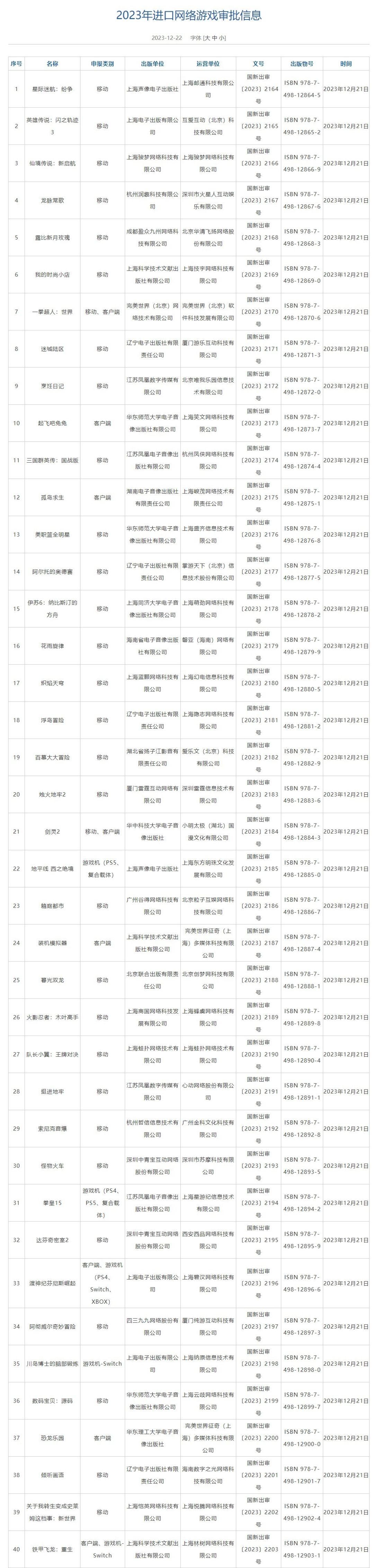 好耶!新一批进口网络游戏版号发放,《绯染天空》《浮岛冒险》《挺进地牢》《龙脉常歌》《一拳超人:世界》《英雄传说:闪之轨迹3》《阿尔托的奥德赛》《花雨旋律》《烛火地牢2》《剑灵2》《倾听画语》等 40 款游戏获得版号。
