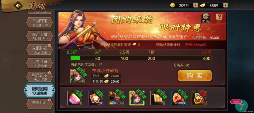 庆典热点汇总主题活动,分外娆娆副本王者驾临,曹魏二把手惊才绝艳冬日浓情,狩猎UP三宠齐至充值享好礼,惠利送不停三国夺宝异宝来袭,幸运宝藏好运不断奇珍商肆、点券商铺,稀缺尖品应有尽有双倍收益,事半功倍限时团购、时装限购,好事成双精彩纷呈至强祭石,节日成就