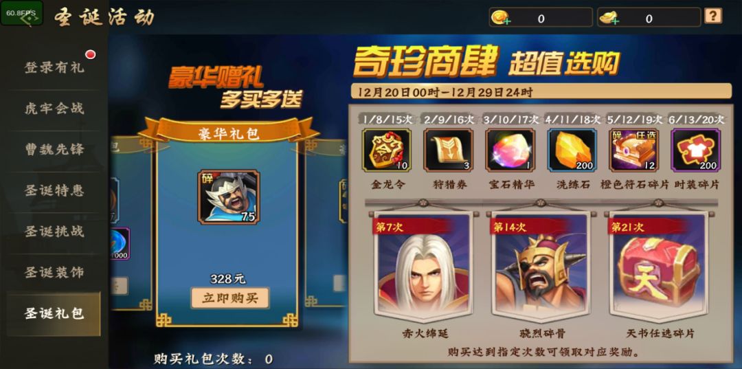 此次圣诞活动将限时出售圣诞礼包,玩家购买礼包达指定次数可获得周瑜、虎卫夏侯惇最新款传说级时装和天书任选碎片等稀有道具奖励,多买多送,同时还能计入累计充值。