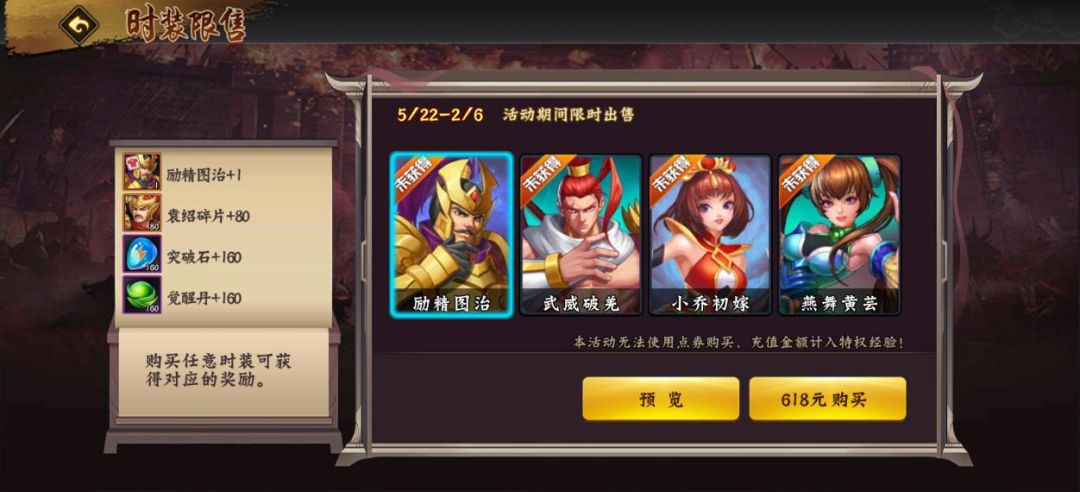 拥有一套华丽的时装,不仅能让自己的武将看上去更具气势,同时附带的5%移速加成,让武将快人一步、如虎添翼。两期返场时装包括神武小乔“韶容牵思”、虎卫张郃“江陵破吴”、神武孙尚香“朝华如意”、鲁肃“鼎足天下”等武将时装。购买指定时装的玩家系统还将额外赠送丰厚的奖励,绝对物有所值!