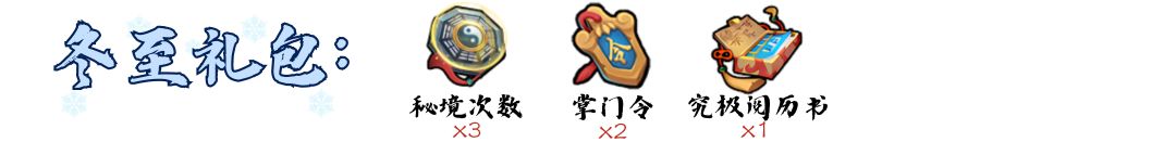 冬至礼包内容:秘境次数*3、掌门令*2、究极阅历书*1