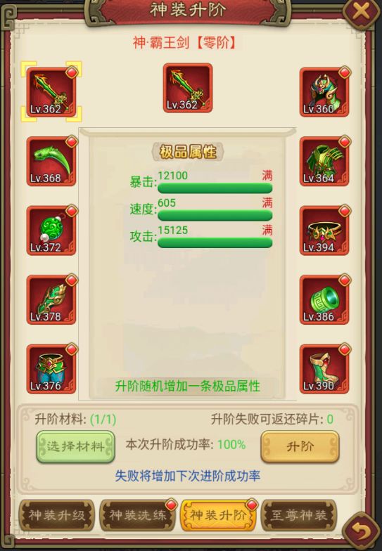 当到了后期,主公们甚至可以通过至尊神装功能,实现装备的至尊升阶,获得属性的大幅提升。