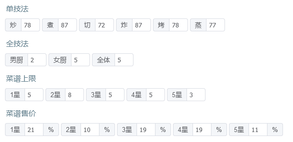 售价修炼和我差不多但五星菜谱上限只有17也适用,但需要月色荷香和蒜蓉芝士焗龙虾的专精。