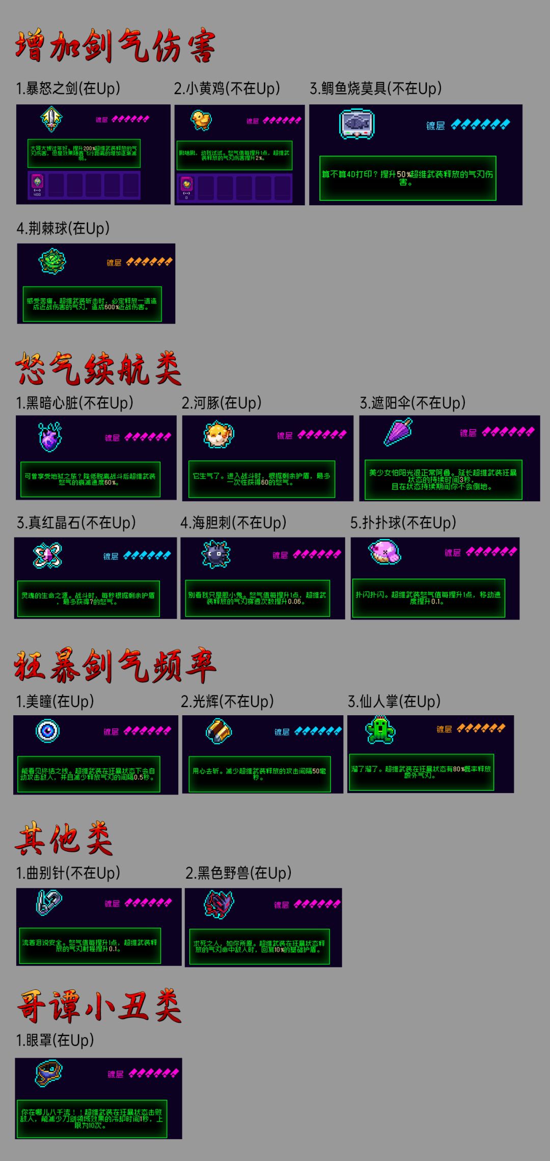 第一类是直接增加剑气伤害,第二类是关于怒气机制的一些衍生道具,第三类是增加狂暴斩击频率的道具,最后一类就是一些特殊效果,增加剑气距离和回复护盾值!