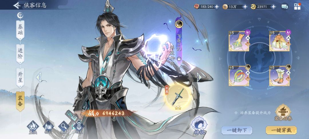 最后从雷灵儿身上扒了2件装备,凑了一套27仙术,配了一套现有最顶级的神祝,也才24万攻击。用这唯一的一个半成品飞蓬可以打老三,经过多次调整,终于顺利过了503。