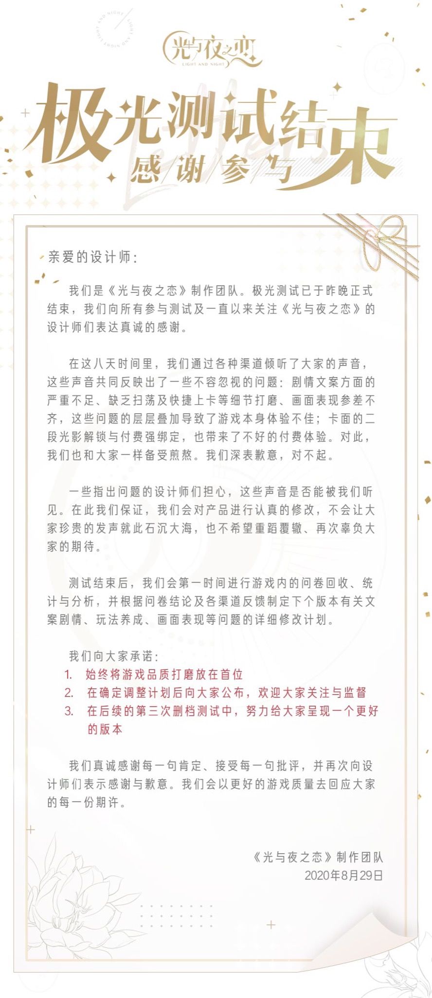 极光测试已正式结束,我们向所有参与测试及一直以来关注《光与夜之恋》的设计师们表达真诚的感谢。对于游戏的不足之处,我们表示由衷的歉意。
