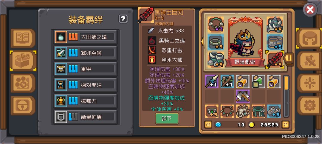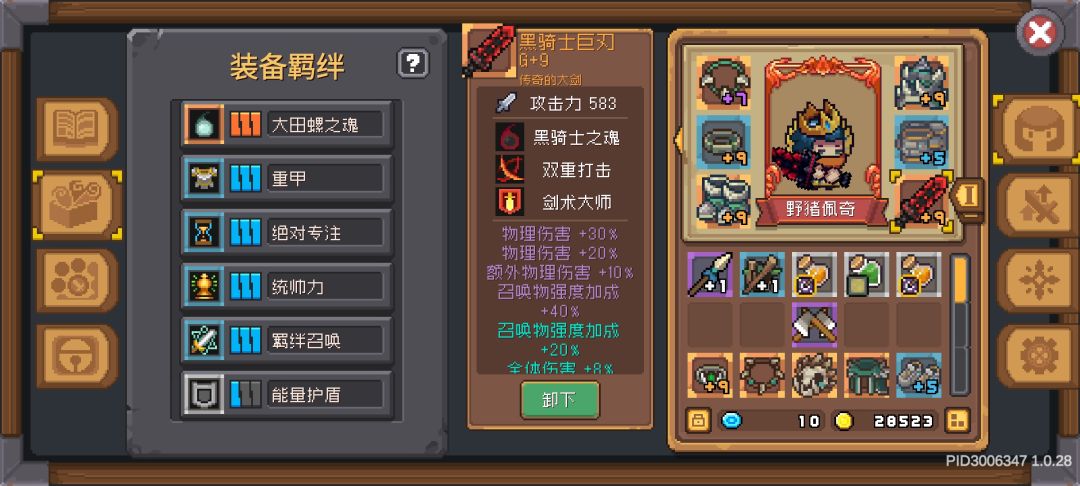 【装备选择】大田螺防具三件套,全力的项链和戒指,黑骑士巨刃(没有全力的双统帅力防具和戒指,所以最好有一件大田螺第三羁绊是统帅力)