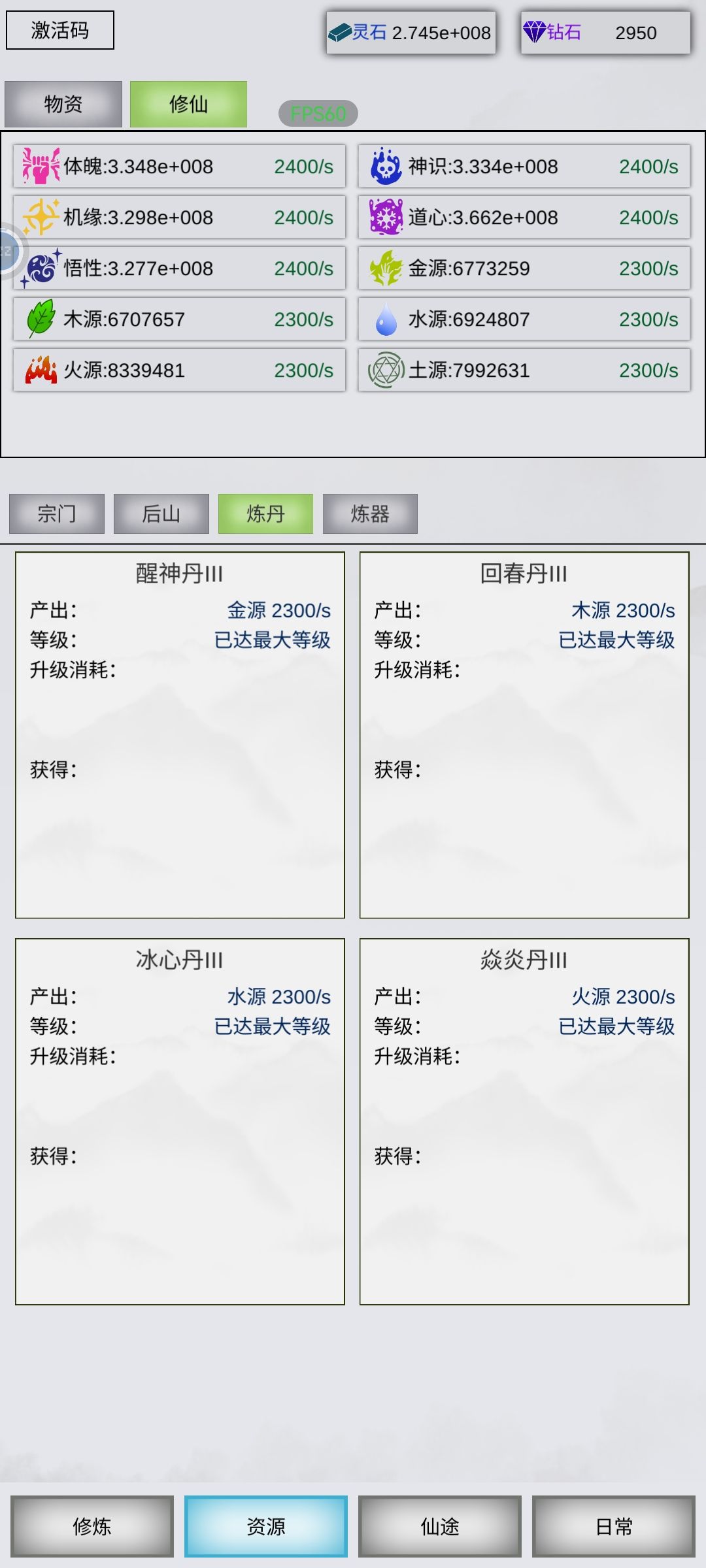 灵木,灵铁,金木水火土+5种材料,已全部最大等级产出,最后再点满大型灵池+大型空间裂缝+轮回丹,需要76天,目前毕业。
