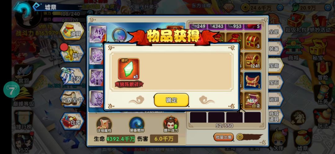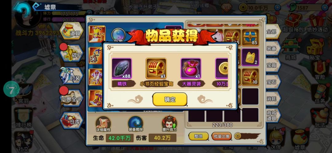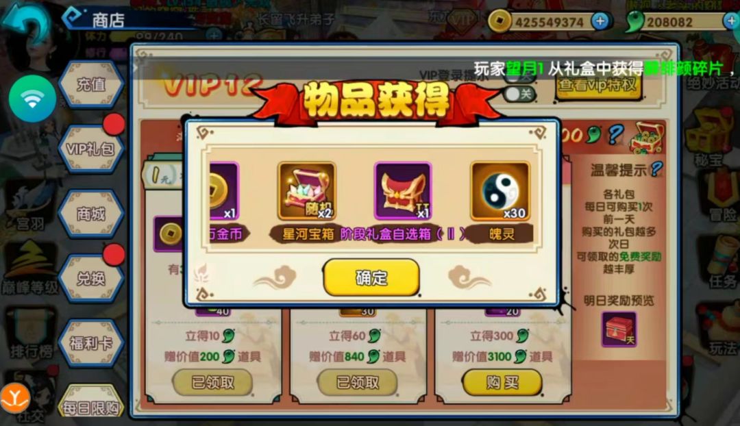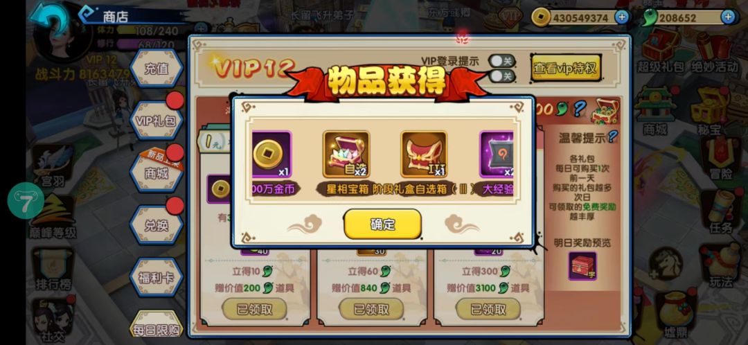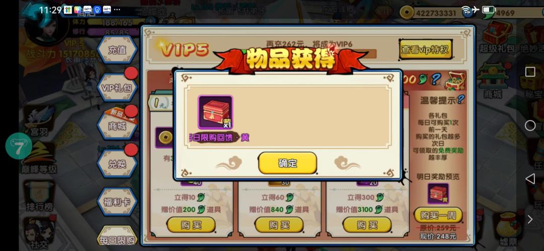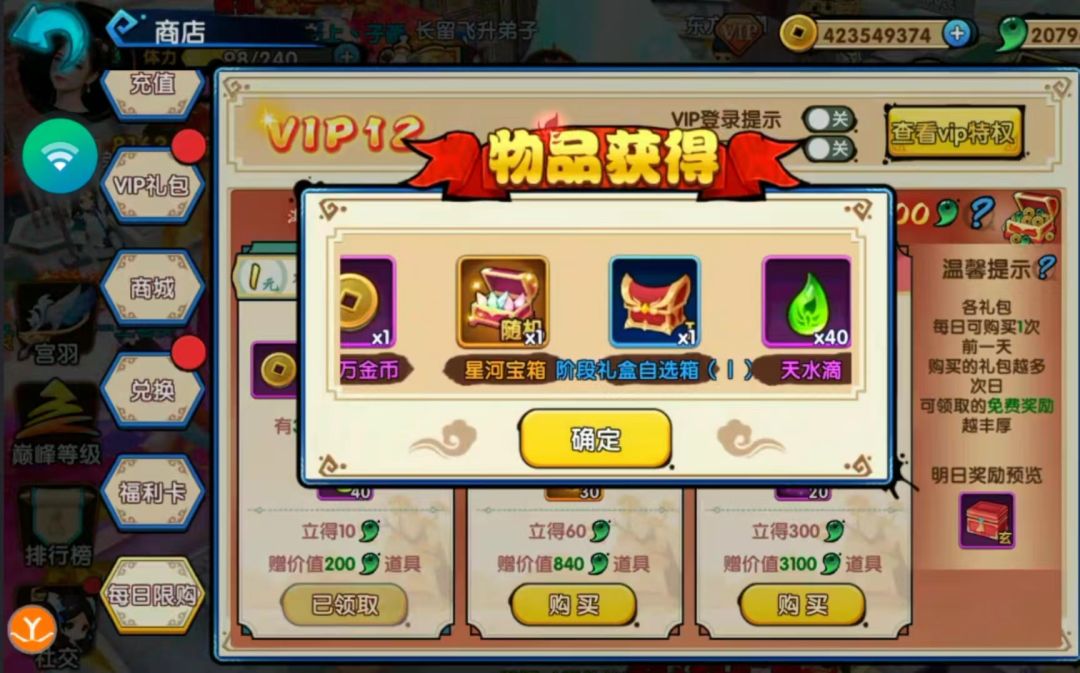 点击商场,每日限购页面免费领取每日限购回馈.黄礼盒,可以获得每日回馈奖励,开启后获得:10万金币,88个精铁,1个大器灵袋,1个小书页经验宝箱。如下图: