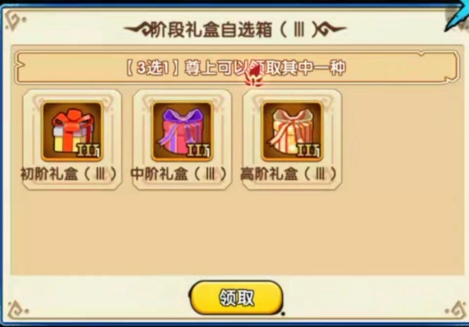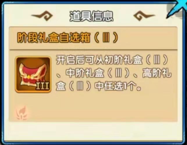 阶段自选箱(III)开启后可从中选取一个:初级礼盒(III)、中阶礼盒(III)、高阶礼盒(III)。如下图: