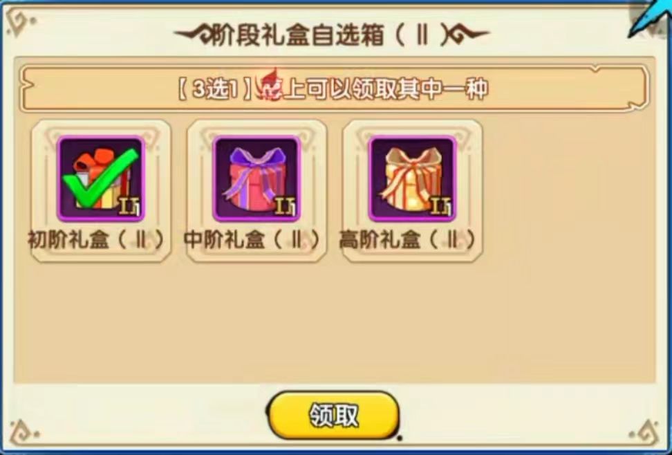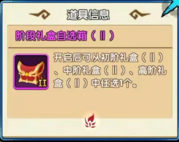 阶段自选箱(II)开启后可从中选取一个:初级礼盒(II)、中阶礼盒(II)、高阶礼盒(II)。如下图:
