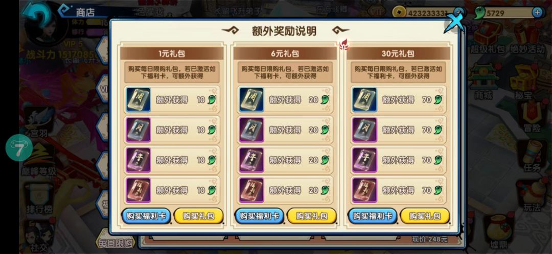 购每日限购礼包最多每日可额外获得400玉。购每日限购礼包,若已激活如下福利卡,可额外获得对应的勾玉奖励,如下图: