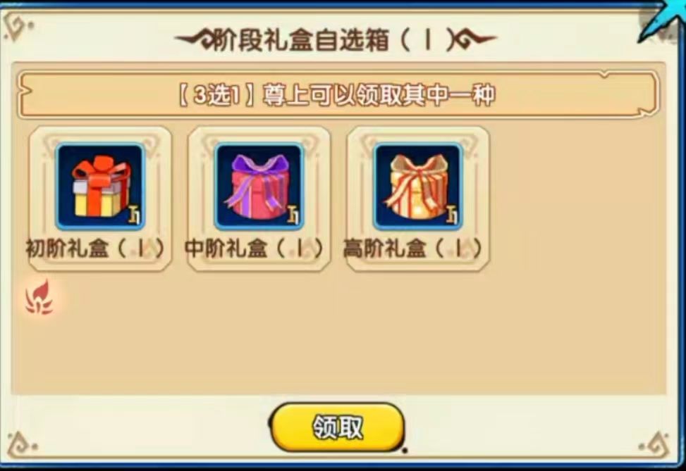 阶段自选箱(I)开启后可从中选取一个:初级礼盒(I)、中阶礼盒(I)、高阶礼盒(I)。如下图: