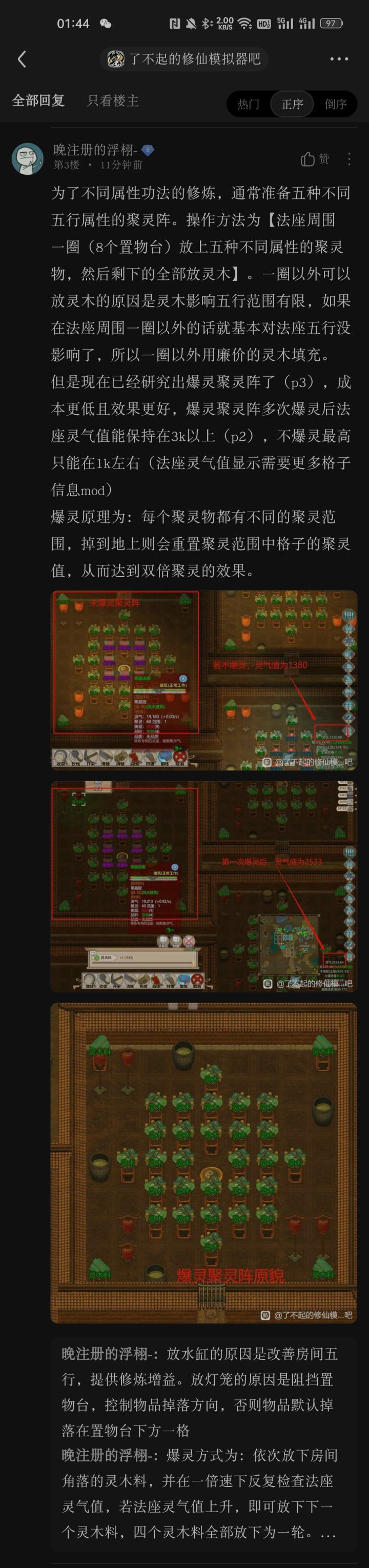 【爆灵作用】现在已经研究出爆灵聚灵阵了(p2)成本更低且效果更好,爆灵聚灵阵多次爆灵后法座灵气值能保持在3k以上(p4),不爆灵最高只能在1k左右。