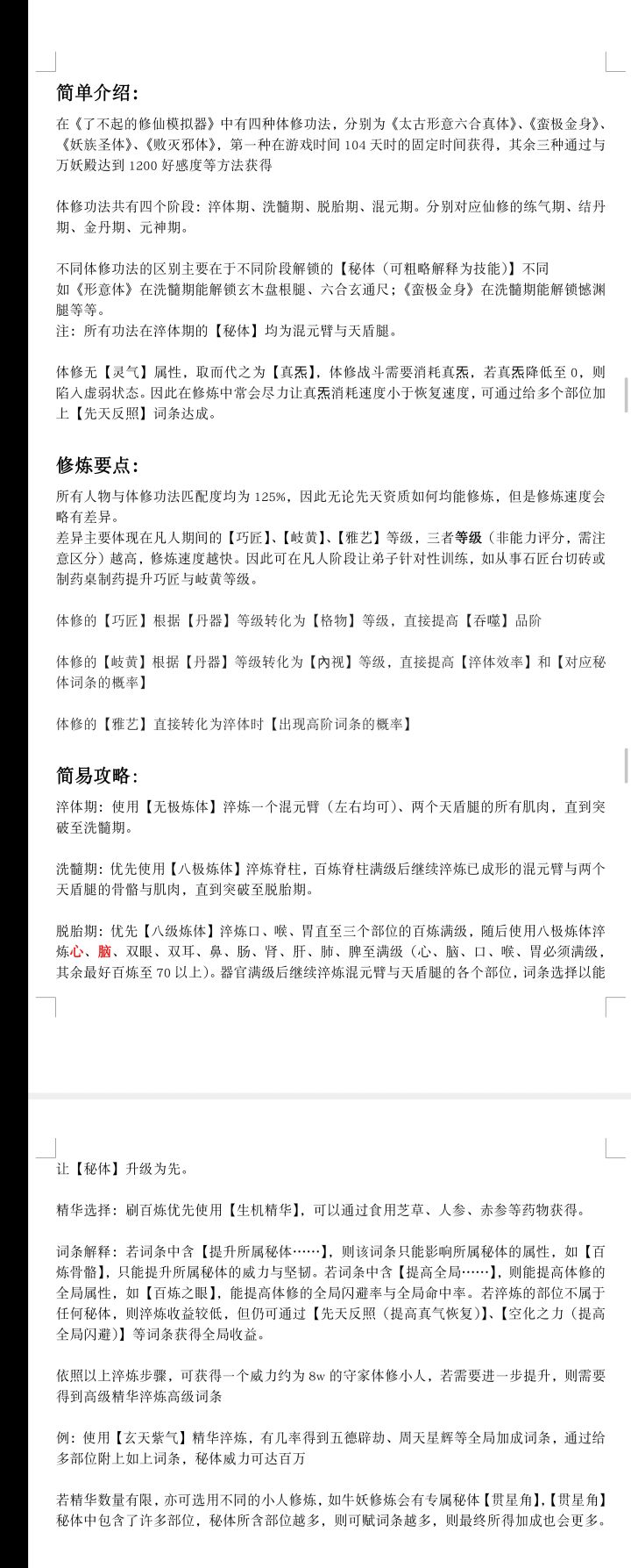 在《了不起的修仙模拟器》中有四种体修功法,分别为《太古形意六合真体》、《蛮极金身》、《妖族圣体》、《败灭邪体》,第一种在游戏时间104天时的固定时间获得,其余三种通过与万妖殿达到1200好感度等方法获得
