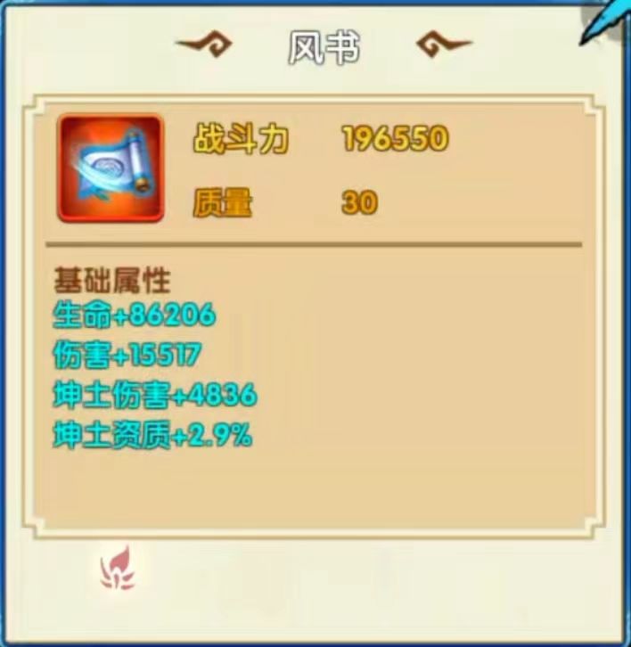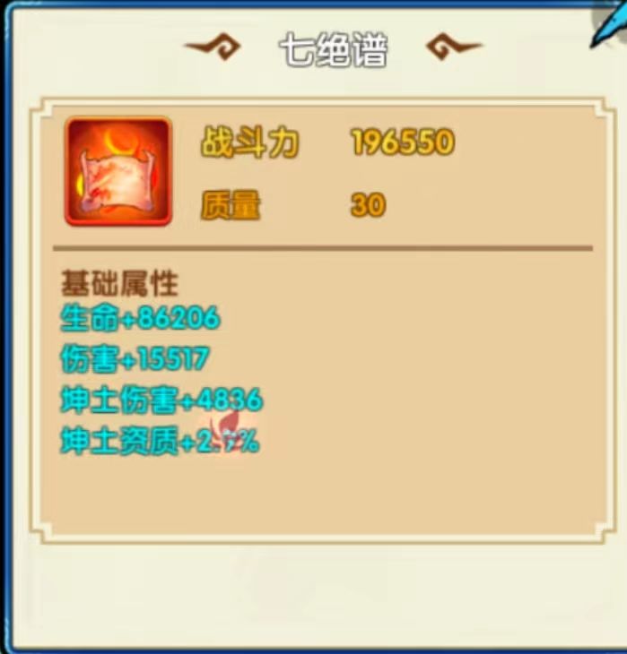 升星主材料七绝谱、离愁珠、风书,可在战阵界面将此道具启动,增强全体伙伴的能力。七绝谱、离愁珠、风书战斗力属性相同,战斗力196550,质量30,基属性如下:生命+86206,伤害+15517,坤土伤害+4836,坤土资质+2.9%。
