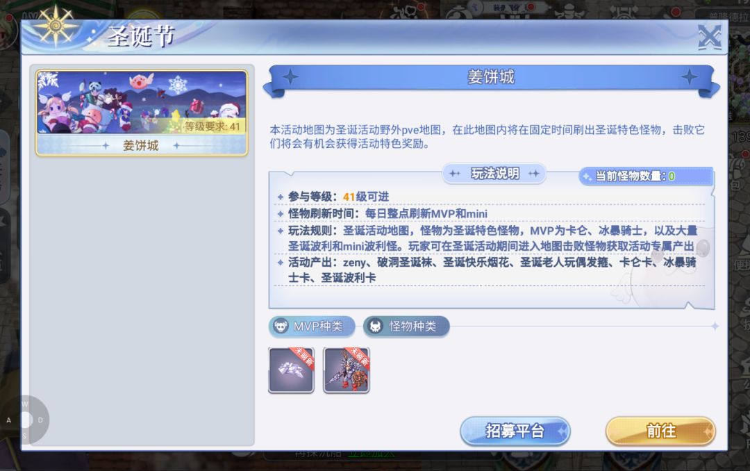 每天整点,该地图中的MVP和mini BOSS都会刷新,主要的BOSS是卡仑和冰暴骑士。击败它们后,有机会掉落圣诞老人玩偶发箍和BOSS的传说卡片。