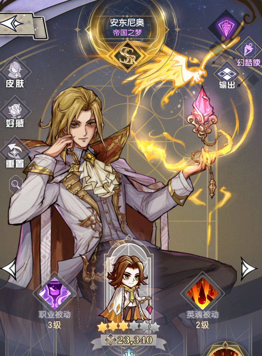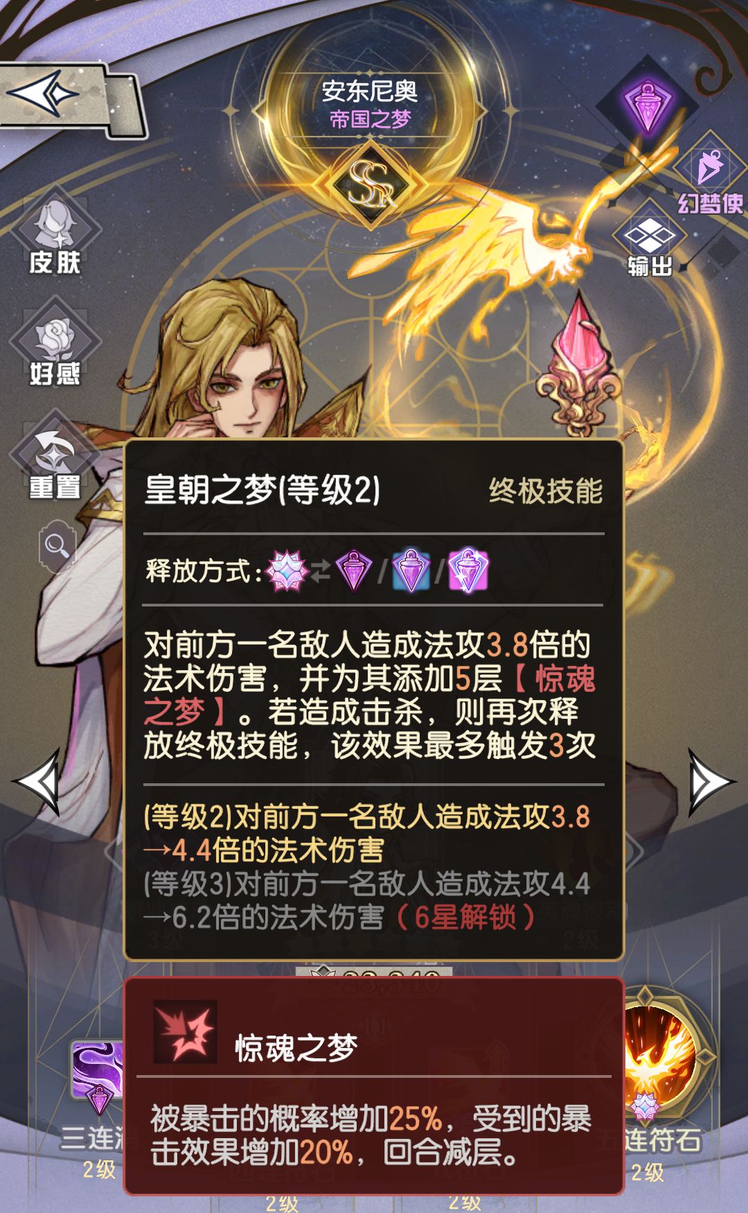 诡异石像的被动需要注意下,当每有小野怪存活时,boss受到的伤害减少30%,也就是说,小怪满员时,诡异石像获得90%减伤,基本无敌,所以我们首先要解决小野怪。这时候群体伤害就派上用场了,德博拉带控制,韦伯斯特伤害高,都好用。至于幻梦使,我选核弹安东尼奥,大招倍率最高可达6.2倍,配合暴击,不敢想有多爽。