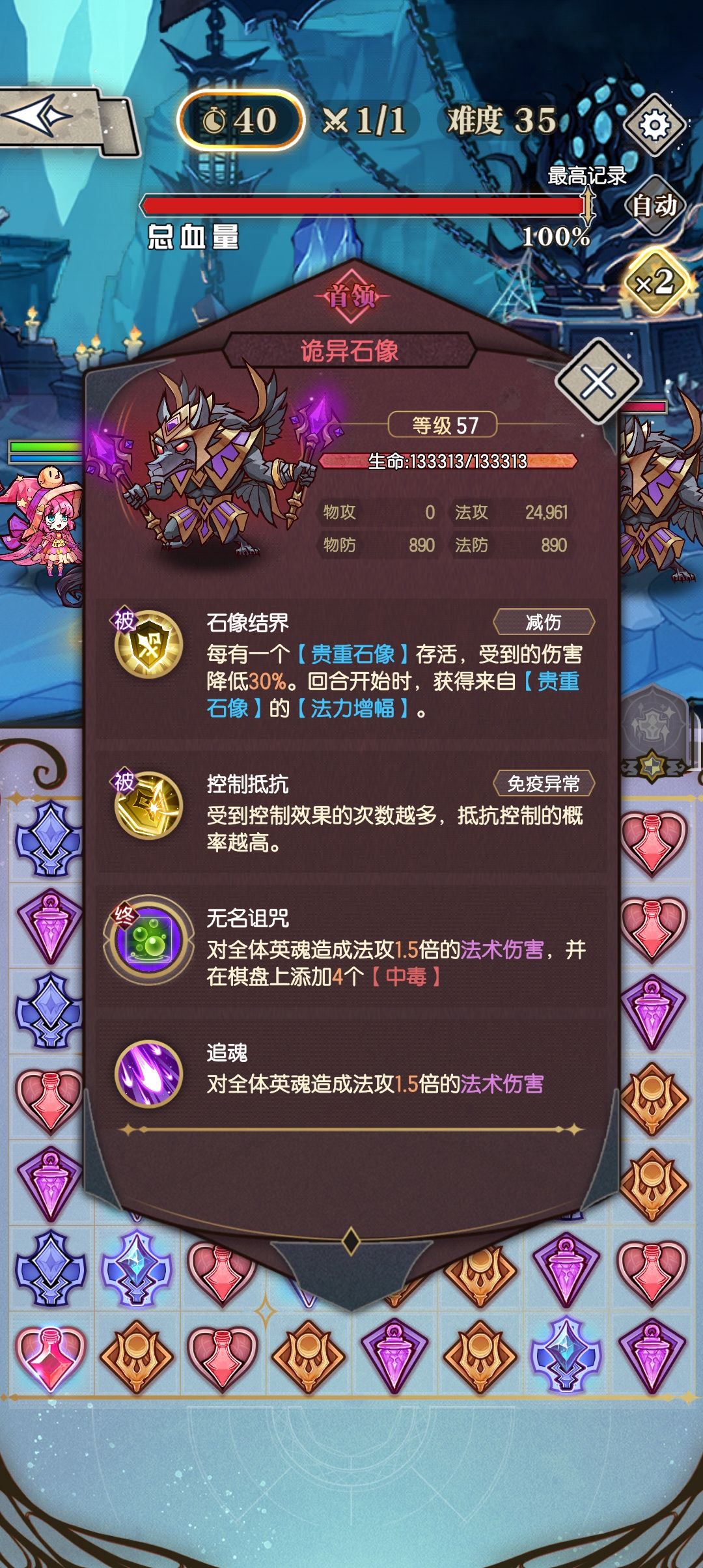 诡异石像的普通技能是全员1.5倍法攻,终极技能外加4个中毒符石,冷却都是四回合。由于法术队元素使的群攻特效的存在,使得战斗不像打肖恩那样小心翼翼,元素潮汐被动好了就丢技能,能够很快解决前排小怪,没有小怪减伤的加持,大怪也坚持不了几个回合,难度不大。