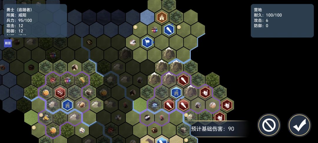 第二波就简单多了,还是二城防守,最好右边入侵,和第一波一样,二城左下布阵,一两个弓箭手加一个骑兵弓箭手打一下,追随者骑兵,学死战,强攻,就能秒80多血(我学的孤军伤害低一点,位置在我攻击右边一格,伤害更高12点,加强强攻甚至估计能满血秒杀)。另外一路刷海面进攻3城,用帆船随便打落水狗