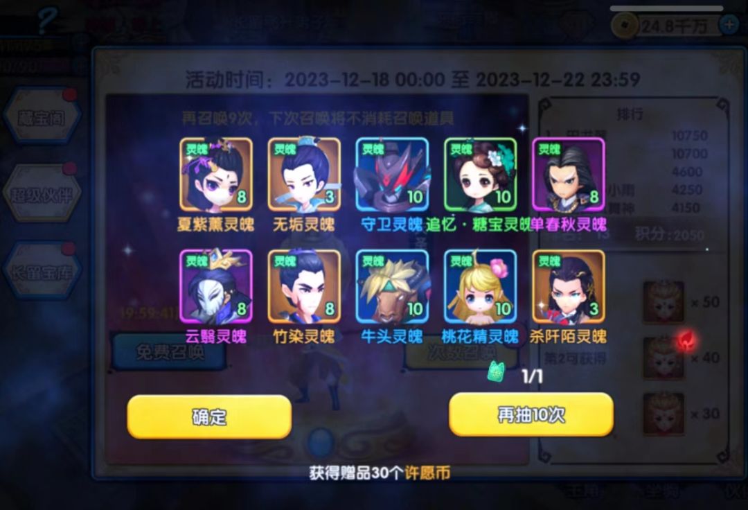 伙伴十抽卷转动一次宝库,可以获得10组伙伴碎片,如下图: