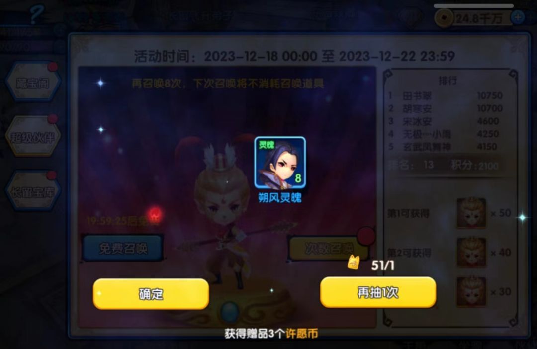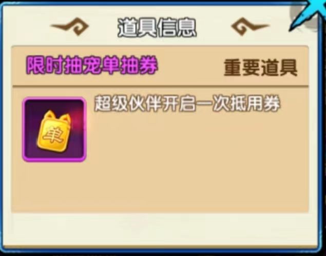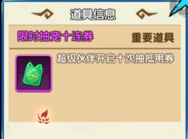 超级伙伴:系统每5天推出不同橙色宠物进行抽取,每24小时可以免费召唤一次。伙伴单抽卷,转动一次宝库,可以获得1组伙伴碎片(8个紫色伙伴或3个橙色伙伴碎片)。伙伴十抽卷转动一次宝库,可以获得10组伙伴碎片(8个紫色伙伴, 3个橙色伙伴碎片,或8个橙色伙伴碎片)。单次召唤每天最多可以召唤50次。十次召唤每天最多可以召唤20次。