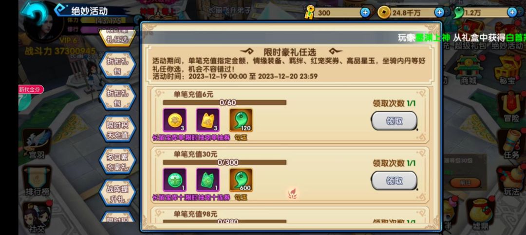 系统会不定期推伙伴单抽卷,伙伴十抽卷活动,码头黑市也有机会获得伙伴单抽卷,伙伴十抽卷,喜欢的上仙可以关注一下。如下图: